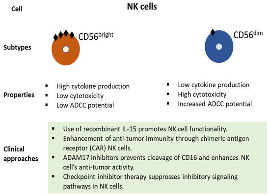 Broad subtypes of NK cells, their function, and potential clinical approaches with therapeutic benefits.