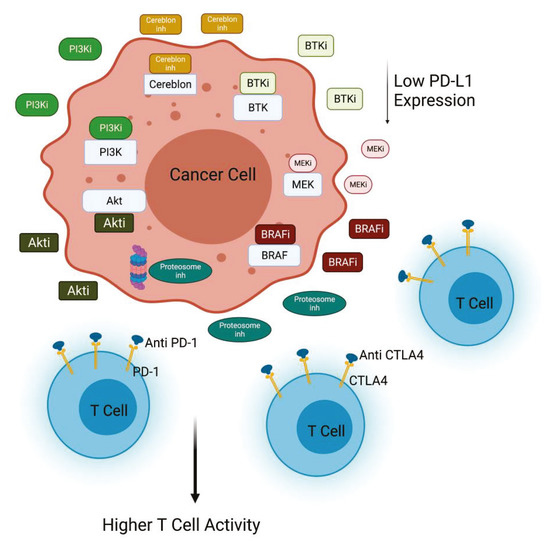 PI3K/Akt inactivation combined with immunomodulatory agents. Inhibition of PI3K or Akt decreases PD-L1 expression in cancer cells, contributing to the efficacy of anti-PD1 treatment. PI3K inhibitors in combination with different inhibitors (anti-CTLA4, BRAFi, BTKi, MEKi, Proteasome inhi) improves T cell killing activity against cancer cells (Created with BioRender.com: agreement number ZU22NUG38X).