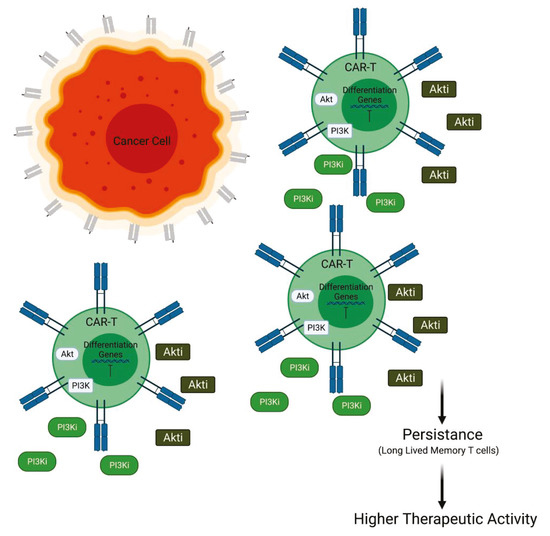 Generally, for the treatment of AML, CAR T cells targeting CD33 antigen, a transmembrane receptor highly expressed on leukemia cells, have been developed. The efficacy of this cell-based therapy is sustained by in vivo experiments involving a mice model. In this murine model, the efficacy of PI3K inhibition was tested in combination with the infusion of CD33.CAR T cells. At day 14 after transfer, it was observed that the persistence of CD33.CAR T cells in liver and spleen was improved by the administration of PI3K inhibitors LY294002 (LY), resulting in reduced tumor burden. The addition of LY is also able to maintain the less differentiated phenotype of CAR T cells and to enhance the total cell number. The anti-tumor efficacy is needed to be further improved to find better experimental conditions for PI3K inhibition [50]. Other authors have focused their attention on the downstream PI3K effector Akt in order to improve CAR T cell efficacy. In particular, interesting data have been provided by experiments involving CAR T cells directed to epithelial cell adhesion molecule (EpCAM-CAR T). In this context, Akt inhibition does not suppress proliferation or effector function but increases the number of CAR-positive cells and inhibits the terminal differentiation of the EpCAM-CAR T cells. Furthermore, the EpCAM-CAR T cells, expanded in the presence of Akt inhibitor (Akti) MK2206, appeared to have enhanced antitumor activity in vivo. Taken together, these findings suggest that Akt inhibition during the initial stage of CAR T cell preparation could improve the performance of CAR T cells. These studies demonstrate that the Akti does not suppress EpCAM-CAR T cell expansion, viability, or effector functions but promotes the generation of memory EpCAM-CAR T cells with enhanced CAR-positive expression rates and greater antitumor activity in an in vivo model [47]. Moreover, it has been suggested that the sustained activity of Akt induces terminal differentiation in T cells and leads to decreased antitumor activity. Therefore, it was hypothesized that the inhibition of Akt may prevent terminal differentiation of CAR T cells as they are produced to a clinical dose. To evaluate this hypothesis, they performed an experiment of transduction and expansion of CD19 CAR T cells in the presence of an Akti. Akt inhibition during ex vivo expansion resulted in a generation of less differentiated CAR T cells, characterized by high expression of CD62 and CD28, with enhanced antitumor activity in vivo. Finally, it has been suggested that the modulation of Akt could be a good strategy to increase the anti-tumor immunity for adoptive CAR T cell therapy, which could be translatable into the clinical activity with the availability of a pharmaceutically approved Akti [51] (Figure 3).