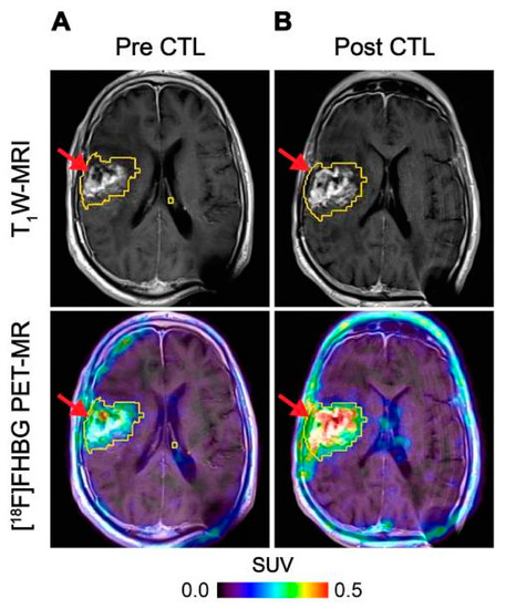 Imaging of HSV1-tk gene reporter expression in genetically modified CTLs with [18F]FHBG. [18F]FHBG-PET imaging was performed in a patient with recurrent glioblastoma multiforme tumour in the right frontoparietal lobe before (A) and 1 week after (B) CTL infusions. Allogeneic CTLs and IL-2 were injected intratumorally (red arrows). Tumour recurrence was monitored by T1-weighted (T1W) MRI (top panels) and [18F]FHBG-PET images were fused with the MR images (bottom panels). A significant increase in [18F]FHBG uptake and PET signal was detected following CTL infusion, which was likely to be due to CTL cell trafficking. Figure reproduced from [51].