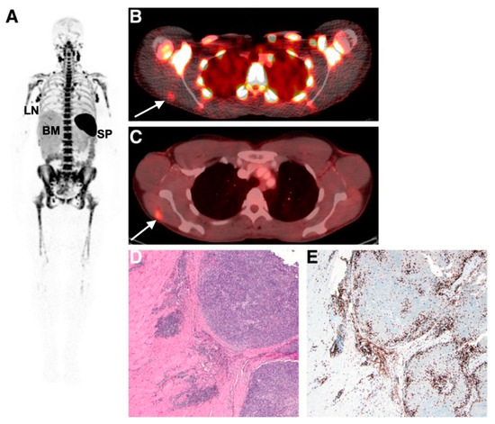 Imaging human T-cell tumour infiltration using [89Zr]Zr-IAB22M2C, a radiolabelled minibody targeting CD8. (A) Normal splenic, bone marrow, and lymph node uptake of the tracer were observed. Uptake of (B) [89Zr]Zr-IAB22M2C and (C) [18F]FDG in a melanoma metastasis in the deltoid muscle of a patient was histologically confirmed as high CD8+ T-cell infiltration (D,E). Figure reproduced from [87].