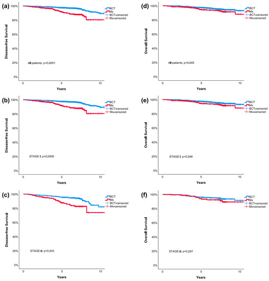 - Corradini, S.; Reitz, D.; Pazos, M.; Schönecker, S.; Braun, M.; Harbeck, N.; Matuschek, C.; Bölke, E.; Ganswindt, U.; Alongi, F.; et al. Mastectomy or breast-conserving therapy for early breast cancer in real-life clinical practice: Outcome comparison of 7565 cases. Cancers 2019, 11, 160. [Google Scholar] [CrossRef] [PubMed]