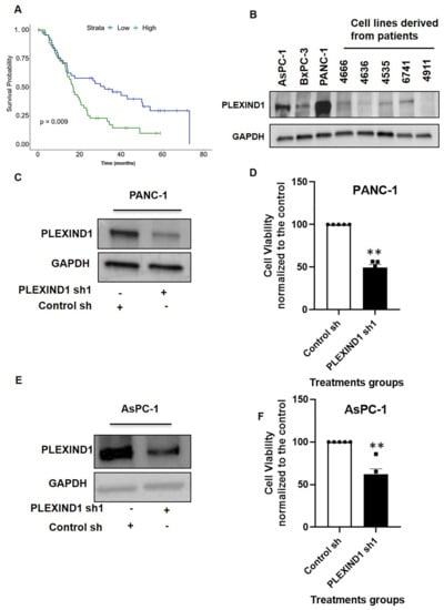 In evaluating the clinical relevance of PLEXIND1 expression in PDAC patients, we found that the higher expression of PLEXIND1 correlated with lower survival probability compared to tumors with lower expression levels (Figure 1A). The median expression value of PLEXIND1 was used to stratify samples (n-94) into high and low expression groups, with the 50% of samples with PLEXIND1 expression values above the median assigned to the high group and the 50% of samples with PLEXIND1 expression values below the median assigned to the low group. Next, we examined the expression of PLEXIND1 in three commercial and five patient-derived PDAC cell lines. Seven of these eight cell lines expressed PLEXIND1, albeit at different levels (Figure 1B). Our findings corroborate a published report where the majority of the PDAC cells evaluated expressed PLEXIND1 [].