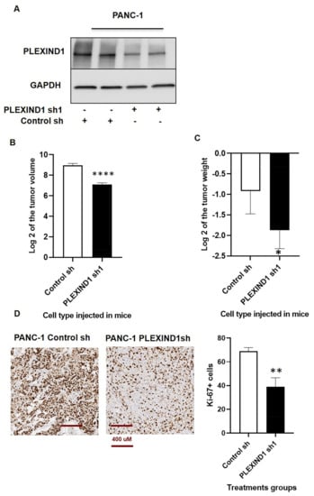 We next investigated the effect of reduced PLEXIND1 expression using orthotopic mice models. Tumors derived from mice implanted with cells treated with PLEXIND1 shRNA (Figure 2A; Supplementary Materials Figure S2A) had lower volumes (Figure 2B; Supplementary Materials Figure S2B) and weight (Figure 2C) than their respective controls. We observed the same trend in tumors obtained from mice injected with cells treated with control or PLEXIND1 sgRNA (Supplementary Materials Figure S2C,D). Similarly, the number of cells that stained positive for Ki-67 were lower in tissues derived from tumors harvested from mice implanted with cells with reduced PLEXIND1 expression, relative to their control counterparts (Figure 2D). These findings corroborate our in vitro results that PLEXIND1 is involved in for tumor growth.