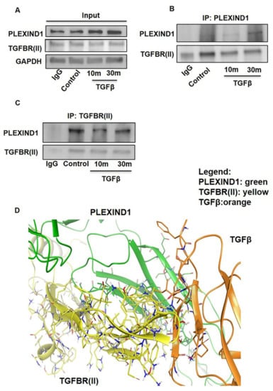 PLEXIND1 and TGFβRII can form an immuno-complex in PDAC. (A): Western blot analysis showing the input samples. (B,C): Co-immunoprecipitation assays showing that PLEXIND1 and TGFBRII are present in the same immunocomplex in PANC-1 cells. (D): Computational modeling analysis showing that PLEXIND1 and TGFBRII can form a complex in the presence of TGFβ.