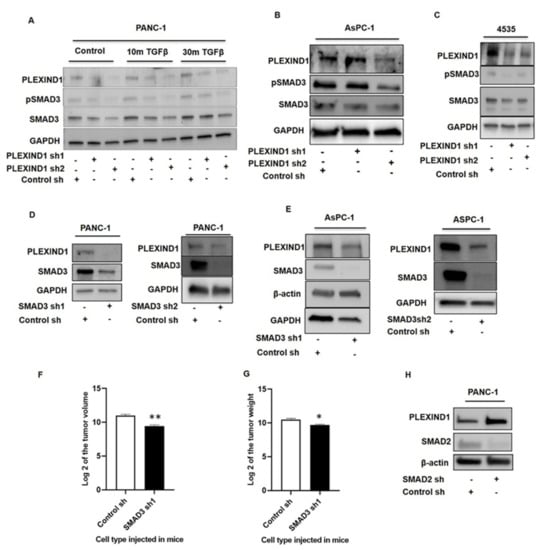 PANC-1 and AsPC-1 cells with SMAD3 knockdown were then generated. Notably, in these cells, the protein levels of PLEXIND1 were reduced as well (Figure 4D,E). We observed no change in PLEXIND1 protein expression in 4535 cells with SMAD3 knockdown (Supplementary Materials Figure S3D). To further examine the role of SMAD3 in our tumor model, we implanted PANC-1 cells with SMAD3 knockdown in orthotropic mice models. The tumors derived from mice that were injected with PANC-1 cells with SMAD3 knockdown had lower volumes and weights compared with those derived from corresponding control mice (Figure 4F,G). Furthermore, immunohistochemical analysis on tissues showed that tumors derived from PANC-1 cells with SMAD3 knockdown had fewer Ki-67 positive cells as compared to their controls, suggesting reduced proliferation (Supplementary Materials Figure S3E). These findings indicate that SMAD3 likely plays a role in PLEXIND1-mediated tumor development, and fits with our model; namely, in PANC-1 cells, PLEXIND1 knockdown leads to SMAD3 downregulation, and the lack of both PLEXIND1 and SMAD3 individually impair tumor growth and development.