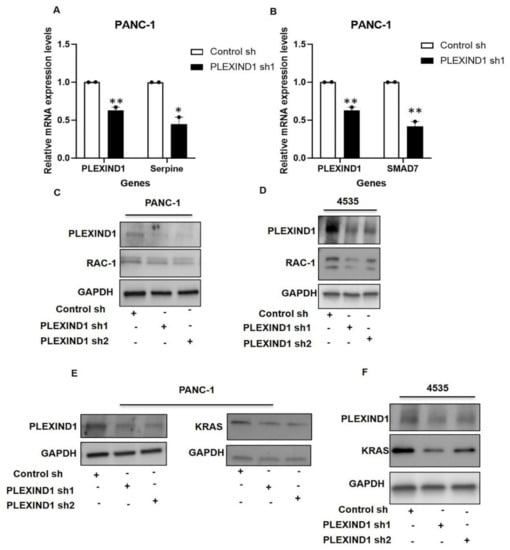 Decreased PLEXIND1 expression results in reduced RAC1 expression in PANC-1 cells. (A,B): Real-time quantifications of Serpine and SMAD7 expression in PANC-1 cell with PLEXIND1 knockdown. (C,D): Western blot analysis showing expression of RAC-1 in PANC-1 and 4535 cells with reduced PLEXIND1 levels. (E,F): Western blot evaluation of KRAS expression in PANC-1 and 4535 cells with PLEXIND1 knockdown. Statistical significance * p < 0.05 vs. control, ** p < 0.01 vs. control. Error bars represent standard error of the mean.