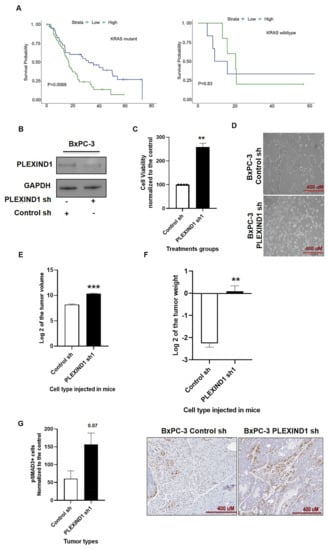 We proceeded to inject BxPC-3 cells with decreased PLEXIND1 into mice (female, 6–8 weeks, SCID). Our in vivo results corroborated our in vitro data. We found that tumors from mice implanted with BxPC-3 cells with PLEXIND1 knockdown had larger tumor volumes and weights compared to their respective controls (Figure 6E,F). Additionally, immunohistochemical analysis on tissues revealed that tumors derived from BxPC-3 cells with lower PLEXIND1 expression had twice the number of Ki-67 positive cells as compared to their controls, supporting a higher proliferation rate (Supplementary Materials Figure S5C).