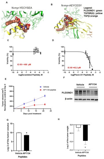 Therapeutic potential of peptide-mediated targeting of PLEXIND1. (A,B): Computational modeling showing YECYSEA and AEYCESY sequences interacting with PLEXIND1- TFGBRII-TGFβ complex. The peptide is shown in orange carbon “sticks”, and the nearby PLEXIND1 residues are shown in gray carbons (but residues of type Ala or Asp are shown in purple carbon). (C,D): Cell viability assays for PANC-1 cells treated with either scramble or PLEXIND1 targeting peptide. (E): Tumor volume from NSG mice models in which first tumors were grown until about 250 mm3 and then were treated with either vehicle (control) or AP1134. (F): Western blot analysis confirming the reduced expression of PLEXIND1 upon AP1134 peptide treatment. (G,H): Log 2 values of tumor volumes and weights from NSG mice treated with either vehicle (control) or AP1134 at the termination of the experiment. * p < 0.05 vs. control. Error bars represent standard error of the mean.