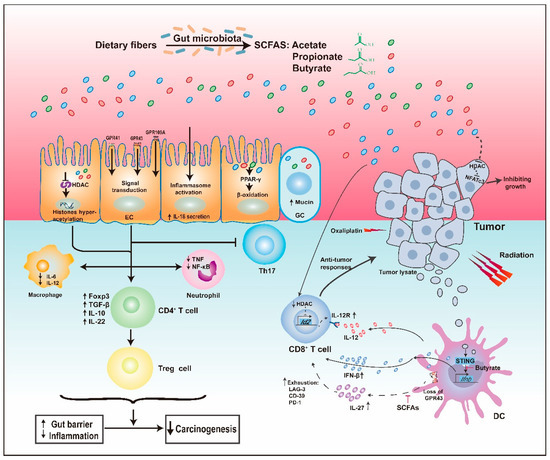 Apart from their effects on innate immune cells, SCFAs also influence the homeostasis of peripheral T cells via HDAC inhibition, particularly facilitating the differentiation of regulatory T cells (Tregs), which is essential to the containment of intestinal inflammation and subsequent tumorigenesis [36,37,38]. Specifically, by promoting hyperacetylation at the promoter and conserved non-coding sequence 1 (CNS1) of the forkhead box P3 (FOXP3) locus, butyrate and propionate increased the expression of the FOXP3 gene, expanded the peripheral pool size of colonic Tregs, and induced functional IL-10-producing colonic Tregs [37,39]. Notably, acetate, previously not recognized as an inhibitor of HDAC (HDACi), was also found to inhibit HDACs, but only in active immune responses [40]. Significantly, He et al. recently report that butyrate directly enhanced cytotoxic CD8+ T cell response through ID2-dependent IL-12 signaling via its HDAC inhibitory activity, thus promoting the antitumor efficacy of oxaliplatin and anti-PD-L1 therapy [41].