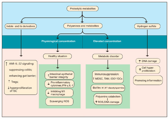 Generally, elevated proteolytic fermentation of a high-protein diet in the gut produces some potentially toxic by-products, such as amines and hydrogen sulfide [15,80]. In the following part, we focus on some representative metabolites and their controversial immunoregulation on the progression of colonic carcinogenesis (Figure 2).