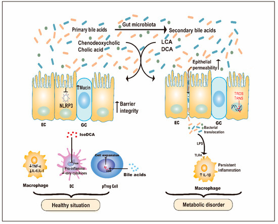 Immunoregulatory effects of bile acids on host cells. Bile acids consist of primary bile acids (such as cholic acid and chenodeoxycholic acid) and secondary bile acids, including deoxycholic acid (DCA) and lithocholic acid (LCA). The latter is metabolized from the former by gut microbiota. In the healthy situation, both types of bile acids can inhibit the activation of the NLRP3 inflammasome in epithelial cells (ECs), downregulate proinflammatory cytokines, such as IL-6 and IL-1, in macrophages and dendritic cells (DCs), and promote peripheral-induced regulatory T (pTreg) cell expansion in a vitamin D receptor (VDR)-dependent manner. IsoDCA, a secondary bile acid, contributes to pTreg cell expansion by counteracting farnesoid X receptor (FXR) in DCs. Additionally, they promote the secretion of mucin in goblet cells (GCs), which helps to enhance the gut barrier. However, when there is a metabolic disorder caused by a high-fat diet, the concentration of bile acids, especially secondary bile acids, are elevated, resulting in a high level of reactive oxygen species (ROS) and reactive nitrogen species (RNS), and increased epithelial permeability, which causes translocation of bacteria and their metabolites and persistent inflammation.