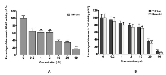 P-bi-TAT effect on leukemic cell lines. (A) THP1-lucia NF-kB activity (luciferase assay) after 48-h treatment, (B) THP1-lucia and Kasumi-1 cell vitality (MTT assay) after 48-h treatment. Results are expressed as mean ± S.D., n = 3. (*** p < 0.0001, ** p < 0.001, * p < 0.01).