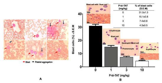 Evaluation of blast cells in peripheral blood smear. (A) Blast cells in the blood smears of NOD/SCID mice injected with THP1-lucia after 16 days. Red arrow, blast cells; Black arrow, platelets aggregation. (B) Blood smear with Lishman stain represent AML control blood smears vs. P-bi-TAT-treated animal cells. Control group shows many blast cells in the peripheral blood, and P-bi-TAT (3 mg/kg) treated animal shows no blast cells. Results are expressed as mean ± S.D., n = 4–5 mice/group.