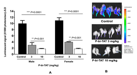 These experiments showed that P-bi-TAT treatments at different concentrations demonstrated a concentration-dependent decrease in NF-κB activity in THP-1-Luc cells (from 40% to 90% inhibition). Furthermore, the treatment of human leukemic cells with 10 µM P-bi-TAT (the dose that manifested marked anticancer activity in vivo) was associated with ~65% decrease in NF-κB activity (p < 0.0001) (Figure 1B).
