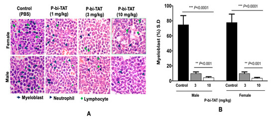 Myeloblast in bone marrow of NOD/SCID mice after 21 days of treatment with P-bi-TAT (3, and 10 mg/kg) (A) Blast cells decreased ~75–85% in comparison to the control group. (B) Percentage of myeloblast in bone marrow. Results are expressed as mean ± S.D., n = 4–5 mice/group, *** p < 0.001, ** p < 0.0001.