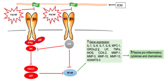 Scheme of the mechanism of P-bi-TAT in blocking thyrointegrin αvβ3 and its impact on NF-kB signaling pathways. Extracellular matrix (ECM) contains the RGD cell binding sequence that can bind to the thyrointegrin αvβ3 and initiate a cell signaling cascade that results in increased expression of pro-inflammatory mediators. P-bi-TAT interferes with the interaction between RGD and thyrointegrin αvβ3, resulting in downregulation of multiple signaling pathways (FAK-Src, ERK, and AKT). P-bi-TAT downregulates NF-kB signaling pathway through activation of FAK signaling pathway. P-bi-TAT interferes with the action of NF-kB, resulting in downregulation of plasma pro-inflammatory cytokines. Red = inhibition, green = activation. Abbreviations: ADAMT = a disintegrin and metalloproteinase with a thrombospondin, RGD = arginyl glycyl aspartic acid, ERK = extracellular-signal-regulated kinase, FAK = focal adhesion kinase, IL = interleukin, MMP = Matrix metalloproteinase, PKC = protein kinase C, PTK2 = protein tyrosine kinase 2, and NF-κB = nuclear factor kappa-light-chain B.