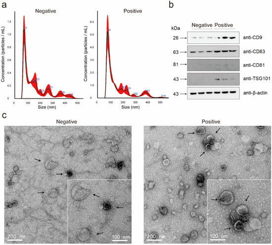 Characteristics of urinary exosomes. (a) Nanotracking analysis shows the size distribution of the urinary exosomes of the biopsy-negative and biopsy-positive patients. The particle size of the urine exosomes was concentrated at 40–160 nm in both the biopsy-negative and biopsy-positive patients. The particle size peak distribution of the urinary exosomes of the biopsy-negative and biopsy-positive patients was at 75 nm and 86 nm, respectively. (b) Analysis of the expression of the exosomal markers CD9, CD63, CD81, TSG101 and internal control ACTB using Western blots. (c) Transmission electron microscopy graphs show the morphology of the urine exosomes of the biopsy-negative and biopsy-positive patients. The arrows were used to point the representative exosomes.