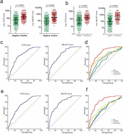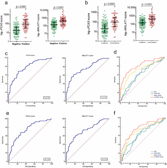 The lncRNA assay predicted the initial biopsy results. (a) Urinary exosomal PCA3 and MALAT1 were significantly increased in the PCa patients compared to the patients with a negative prostate biopsy (PCA3: p < 0.001; MALAT1: p < 0.001). (b) Urinary exosomal PCA3 and MALAT1 were significantly increased in the clinically significant PCa patients compared with the patients with nonaggressive disease (PCA3: p < 0.001; MALAT1: p < 0.001). The ROC analysis shows the diagnostic power of the PCA3 score and the MALAT1 score in PCa (c) and clinically significant PCa (e). Comparison ROC analysis shows that the lncRNA assay has a better diagnostic performance than fPSA/PSA, PSA and the base model in PCa (d) and clinically significant PCa diagnosis (f). ROC—receiver operating characteristic; PCA3—prostate cancer antigen 3; MALAT1—metastasis-associated lung adenocarcinoma transcript 1.