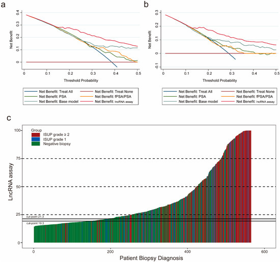 Clinical utility of the lncRNA assay. The decision curve analysis shows that the lncRNA assay presents the highest net benefit across all threshold probabilities for diagnosing PCa (a) and high-grade PCa (b). The dark red horizontal line parallel to the x-axis represents no patient undergoing a biopsy (Treat None). The blue line indicates that all the patients will have PCa (Treat All). (c) Waterfall plot of the lncRNA assay scores in relation to the prostate biopsy results (n = 565). Each bar represents an individual. Red indicates the ISUP grade ≥ two tumors (GS ≥ 7); blue indicates the ISUP grade of one tumor (GS = 6); green indicates the negative biopsies. Two black horizontal lines represent the cutoff points of 21.3 at the sensitivity of 90% and 19.3 at the sensitivity of 95%. ISUP: International Society of Urological Pathology.