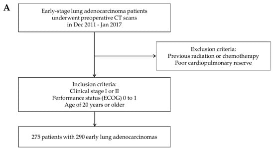 Data from a prospective clinical trial of early-stage lung ADC patients who underwent preoperative contrast enhanced CT scans (NCT01482585) were used for the training dataset. The training dataset that was used to build the deep learning model consisted of 275 patients with 290 early lung ADCs recruited from Samsung Medical Center (SMC) between December 2011 and January 2017. Some patients had synchronous lung cancer, so the number of lesions was greater than the number of patients. The inclusion criteria were clinical stage I or II lung ADC with a performance status of 0 to 1 on the ECOG scale and age of 20 years or older. Patients with a history of previous radiation or chemotherapy and poor cardiopulmonary reserve were excluded.