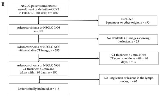 For the validation dataset, we retrospectively evaluated an independent dataset of 416 patients with advanced non-small cell lung cancer (NSCLC) who underwent neoadjuvant concurrent chemoradiation therapy (CCRT) or definitive CCRT at SMC between February 2010 and January 2019. We included patients with stage I A to III B lung ADC who had matched contrast-enhanced CT images performed within 90 days before and after biopsy. Only CT images using thicknesses within 3 mm were included. Patients who were diagnosed with NSCLC of a cell type other than ADC or had CT images that did not meet the above criteria were excluded. Cases in which primary tumors were not clearly seen in the lung or only lymph node metastases were observed were also excluded. Finally, 416 patients were included in the validation dataset. All these patients’ inclusion processes are illustrated in Figure 1A,B. All patients provided written informed consent, and study approval was obtained from the Institutional Review Board of SMC, Seoul, Korea.