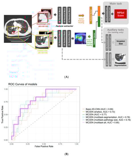 Joint training of a main task with auxiliary tasks can be a very effective method to improve performance in the main task, especially when only small number of training samples are present [,]. Two additional auxiliary tasks are included in our training process. One is pathologic invasion size prediction and the other is a lesion segmentation task. Invasion size was estimated from pathology images by a pathologist. We assigned an additional classifier which takes the final feature vector produced from feature extractors to predict invasion size. For the segmentation task, two additional 3D convolutional layers are branched out from the initial residual block. The final segmentation mask was half the size of the context view. Our loss functions were given as cross-entropy loss after soft-max function for MPSol and segmentation mask prediction and smoothed-L1-loss for pathologic invasion size prediction. As the auxiliary tasks only help our main task (MPSol prediction), tasks are weighted 10:1:1 (MPSol prediction: pathologic invasion size prediction: lesion segmentation).