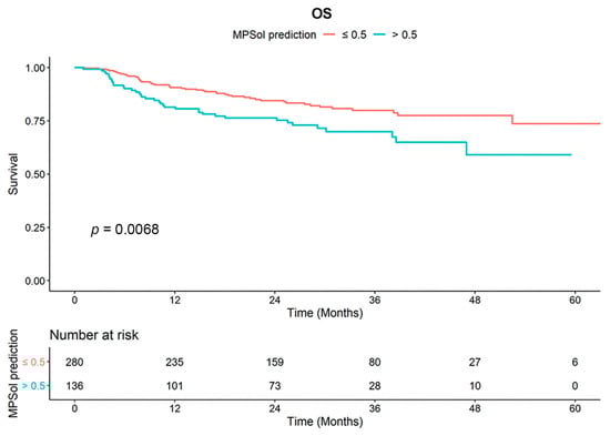 Survival curves for OS according to MPSol probability estimated by MC3DN in the validation set. When the deep learning model was applied to the validation set, a high probability of a high-grade histologic pattern such as the micropapillary and solid pattern (MPSol) was associated with worse overall survival (probability of MPSol >0.5 vs. <0.5; 5-year OS rate 59.0% vs. 73.6%).