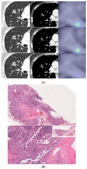 Interestingly, in the cases of a small MPSol as shown in Figure 4 and Figure 5 and Figure S6, the focal area highlighted in the activation map was actually correlated with the focal area of micropapillary or solid pattern in the pathology. In addition, in cases with high MPSol, as shown in Figures S7 and S8, the entire tumor area highlighted in the activation map was correlated with a diffuse area of micropapillary or solid pattern in the pathologic images. This suggested our model has the power to discriminate heterogeneous histologic patterns for given lesions from CT images only.