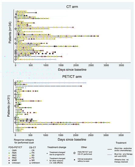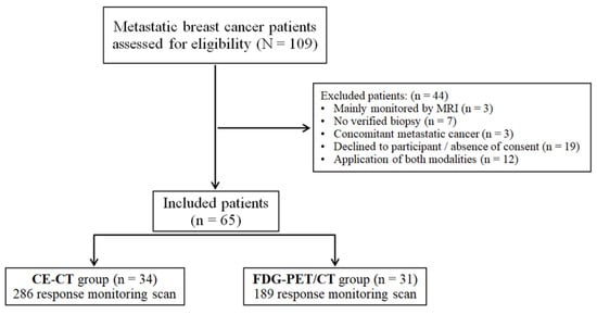 A total of 109 patients were eligible for the study, while 44 patients were subsequently excluded for different reasons, as shown in Figure 1. Of the 65 included patients who were response monitored between 2009 and 2017, 34 were enrolled in the CE-CT group and 31 in the FDG-PET/CT group. Clinical and histopathological characteristics of the primary tumor and metastatic disease are summarized in Table 1 and Table 2, respectively. The study groups were comparable regarding most of the baseline characteristics.