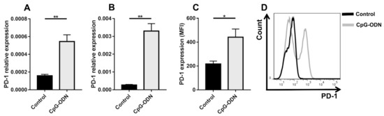 To evaluate PD-1 expression in RAW264.7 macrophages, cells were seeded in 12-well plates (Corning, Glendale, AZ, USA) at a density of 8 × 105 cells/well. The cells were then stimulated with 1 µM CpG-ODNs or left untreated for 6 h. At the end of treatment, the RAW264.7 cells were detached from plates using TrypLE™ Express Enzyme (Thermo Fisher Scientific Inc., Waltham, MA, USA) and incubated with 10 μg/mL anti-mouse PD-1 antibody (clone RMP1-14, BioXCell, West Lebanon, NH, USA) for 30 min at 4 °C. After washing, the cells were incubated with FITC-conjugated anti-rat IgG (H+L) antibody, mouse serum adsorbed (KPL, SeraCare Life Sciences, Milford, MA, USA) for 30 min at 4 °C. Samples were then acquired using a FACSCanto flow cytometer (BD Biosciences, San Jose, CA, USA) and analyzed with FlowJo software (FlowJo LCC, Ashland, OR, USA).
