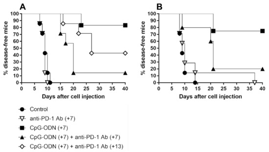 Kaplan–Meier plot of percent disease-free IGROV-1 ovarian tumor-bearing mice treated with CpG-ODNs, an anti-PD-1 antibody or their combination. (A) Mice xenografted with IGROV-1 human ovarian cancer cells were treated i.p. with CpG-ODNs (20 μg/mouse, 5 days/week for 3 weeks, starting seven days after tumor cell injection), treated i.p. with an anti-PD-1 antibody (clone RMP1-24) (200 μg/mouse, 2 times/week for 3 weeks, starting seven (+7) or thirteen (+13) days after tumor cell injection) or administered the combination of these treatments. (B) Mice xenografted with IGROV-1 human ovarian cancer cells were treated i.p. with CpG-ODNs (20 μg/mouse, 5 days/week for 3 weeks, starting seven days after tumor cell injection), treated i.p. with an anti-PD-1 antibody (clone J43) (200 μg/mouse, 2 times/week for 3 weeks, starting seven (+7) days after tumor cell injection) or administered the combination of these treatments. The control group received saline. Numbers in parentheses indicate the number of days between tumor cell injection and the administration of the first treatment. CpG-ODNs: CpG oligodeoxynucleotides; anti-PD-1 Ab: anti-PD-1 antibody.
