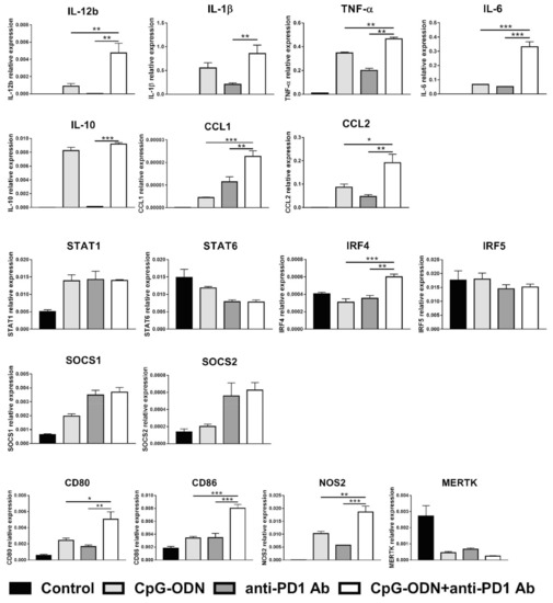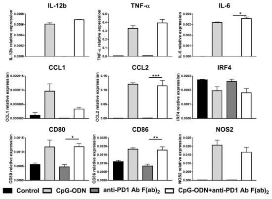Moreover, the expression of the activation markers CD80 and CD86 was more strongly increased in macrophages by CpG-ODN/anti-PD-1 antibody double treatment than by each reagent alone not only at mRNA but also at the protein level, as evaluated by flow cytometry analysis (Figure S3A,B). Similar findings were observed for NOS2, a gene encoding a protein involved in amino acid metabolism [45]. Interestingly, when the expression of different transcription factors important in mediating the acquisition of the M1 or M2 phenotype was evaluated, a higher level of IRF4 mRNA, a peculiar M2 transcription factor [46], was observed when CpG-ODNs and the anti-PD-1 antibody were co-administered than when either reagent was administered alone (Figure 4).