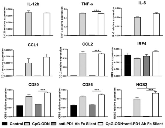 To corroborate the results obtained with the anti-PD-1 antibody F(ab)2, macrophages were incubated with an engineered anti-PD-1 antibody-containing key point mutations in its Fc domain that abrogate its binding to Fc receptors, named anti-PD-1 antibody Fc silent. In line with the previous experiment, none of the analyzed genes were found differentially modulated between CpG-ODN/anti-PD-1 antibody Fc silent- and CpG-ODN-treated macrophages, with the exception of NOS2, the expression of which was significantly but very modestly upregulated in the CpG-ODN/anti-PD-1 antibody-treated group compared to the CpG-ODN alone-treated group (Figure 6).