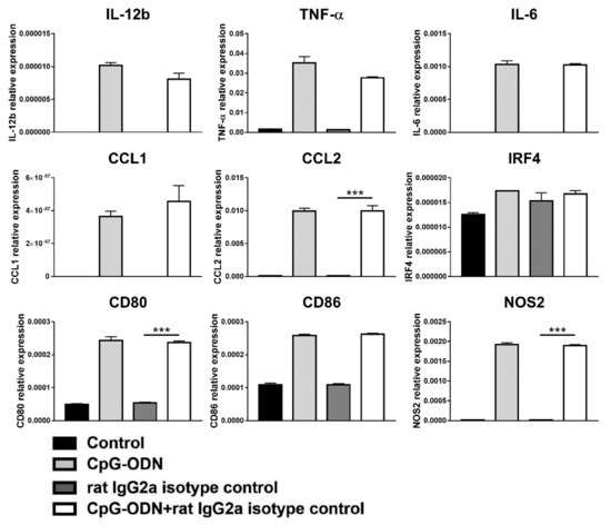 In addition, exposure of macrophages to CpG-ODNs in combination with a rat IgG2a isotype-matched control antibody did not exert any effect on the expression of the analyzed genes (Figure 8), unlike clone RMP1-14 (Figure 4).