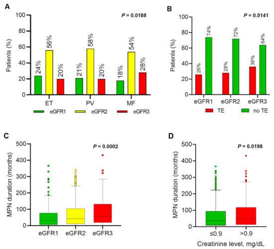 The following are available online at https://www.mdpi.com/article/10.3390/cancers13164086/s1, Table S1: Patient characteristics of the total cohort and by eGFR groups; Table S2: Patient characteristics by eGFR groups in ET patients; Table S3: Patient characteristics by eGFR groups in PV patients; Table S4: Patient characteristics by eGFR groups in MF patients; Table S5: Correlations between uric acid, leukocytes, LDH, and platelets; Table S6: Median MPN duration across eGFR groups; Table S7: MPN duration of >42 months versus ≤ 42 months across eGFR groups; Table S8: Median MPN duration across creatinine groups; Table S9: MPN duration of >42 months versus ≤42 months across creatinine groups; Table S10: Risk factors for MPN duration longer than 42 months; Table S11: Frequencies of thromboses across eGFR groups by risk factor; Table S12: Distribution of arterial and venous thromboembolism across eGFR groups; Table S13: Frequency of HU, RUX, anagrelide/IMIDs/interferon, and no therapy across eGFR groups; Table S14: Frequency of ASA, P2Y12-antagonists, or anticoagulation therapy across eGFR groups.