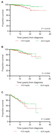 Overall survival according to creatinine level ≤0.9 mg/dL (green) or >0.9 mg/dL (red) at entry into the registry. Creatinine rather than eGFR was used for survival analysis, since the eGFR formula contains age as one of the variables. (A) Survival analysis for pts with essential thrombocythemia (ET); (B) survival analysis for pts with polycythemia vera (PV); (C) survival analysis for pts with myelofibrosis (MF), including pts with primary MF, post-PV MF, and post-ET MF.