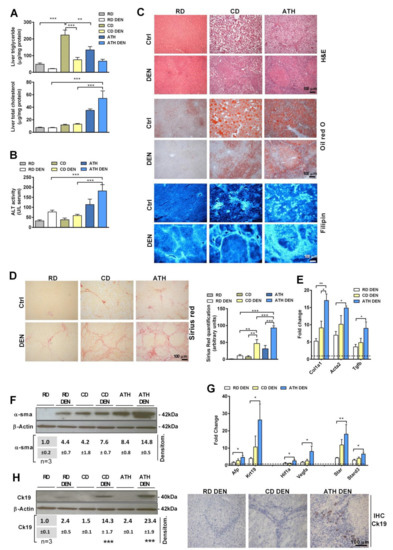 Rats were treated with DEN in the drinking water and fed with RD, CD, or ATH diets for 10 weeks. (A) Hepatic triglyceride and total cholesterol composition livers from animals treated with DEN or the vehicle and fed a regular diet (RD), choline-deficient (CD), or a cholesterol-enriched atherogenic diet (ATH) for 10 weeks. (B) Transaminase serum levels indicative of liver damage in the animals in the different experimental groups. (C) Representative histological staining of liver sections for hematoxylin–eosin (H&E), neutral lipid (Oil Red O), and free cholesterol (filipin). (D) Representative histological staining for collagen fibers (Sirius red) and staining quantification of images by ImageJ. (E) QPCR determination of fibrosis-related gene expression in the liver. (F) Western blot and densitometry of α-SMA in liver tissue, showing significance when compared to their corresponding RD or RD DEN control. Uncropped films from immunoblots in Figure S4. (G) QPCR determination of tumorigenesis markers in the livers of DEN-treated animals. (H) Representative immunoblot with the densitometry analysis as in (F) and representative immunohistochemistry of Ck-19 protein in the livers of animals from different co treated with DEN. Values in qPCR determinations are relative to animals in the RD diet without DEN treatment (value 1.0 depicted as a dotted line) (N = 5–7). All values are the mean ± SEM. Symbols *, **, and *** denote statistically significant differences in ANOVA test and Bonferroni post-test (p < 0.05, p < 0.01, and p < 0.001, respectively).