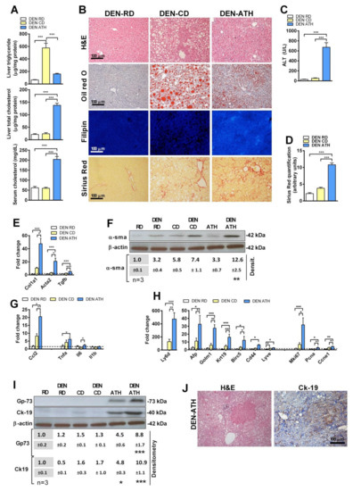 (A) Liver triglyceride, liver cholesterol composition, and serum total cholesterol levels in mice treated with a single injection of DEN at 14 days of age and fed with a regular diet (DEN-RD), choline-deficient (DEN-CD), or cholesterol-enriched atherogenic diet (DEN- ATH) for 24 weeks. (B) Representative histological staining for hematoxylin–eosin (H&E), neutral lipid (Oil Red O), free cholesterol (filipin), and collagen fibers (Sirius red) of liver sections. (C) Transaminase serum levels of DEN-treated animals after 6 months of diet. (D) Sirius red staining quantification of liver sections. (E) QPCR determination of fibrosis-related gene transcription in DEN-treated animals. Values are relative to the animals in the RD diet without the DEN treatment (value 1.0 depicted as a dotted line). (F) Representative immunoblot of fibrosis-marker protein α-smooth muscle actin in liver and a densitometry analysis of the blots relative to the RD group, displaying the significance when compared to their corresponding RD or RD DEN control. Uncropped films from immunoblots in Figure S4. (G) Inflammatory markers determined by qPCR, as in (E). (H) Determination of the HCC and proliferation markers in the liver of DEN-treated animals by qPCR, as in (E). (I) Immunoblot of Gp73 and Ck-19 proteins in the liver of animals from the different groups and its densitometric analysis. Uncropped films from immunoblots in Figure S4. (J) Representative H&E and immunohistochemistry for the CK-19 protein in liver sections of DEN-treated animals. (N = 8–10). All values are the mean ± SEM. *, **, and *** symbolize statistically significant differences between the indicated groups (p < 0.05, p < 0.01, or p < 0.001, respectively) in the ANOVA test with Bonferroni’s post-test.