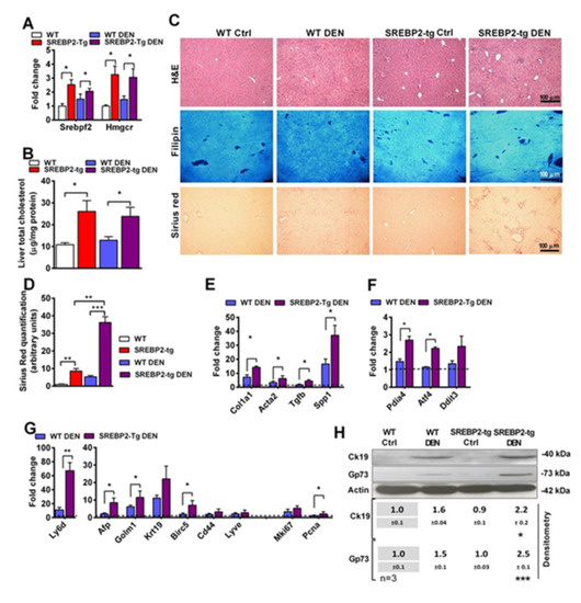To further establish that the increase in cholesterol in the ATH model of NASH potentiates DEN-induced tumorigenesis, we used transgenic mice expressing SREBP-2 (Tg SREBP-2), the master transcription factor that regulates cholesterol synthesis in the endoplasmic reticulum (ER). Tg SREBP-2 mice and wild-type (WT) mice were treated with DEN in the drinking water and fed a regular chow diet for 4 months. As seen, the expression of Srebpf2 and the regulatory enzyme in cholesterol synthesis, Hmgcr, increased two-to-three-fold in Tg SREBP-2 mice with respect to WT mice, independently of the DEN treatment (Figure 3A). In parallel with these findings, the total liver cholesterol levels increased in Tg SREBP-2 mice with or without DEN administration (Figure 3B). Filipin staining indicated the increase of free cholesterol levels in Tg SREBP-2 mice compared with WT mice, while Sirius red staining revealed liver fibrosis in Tg SREBP-2 mice that was potentiated by the DEN treatment (Figure 3C,D), in line with the increased expression of fibrosis genes Col1a1, Acta2, Tgfβ, and Spp1 (Figure 3E). In addition, the constitutive de novo cholesterol synthesis in Tg SREBP-2 resulted in an increased expression of ER stress markers Pdia4 and Atf4 (Figure 3F), a characteristic feature associated with chronic liver disease and HCC development [35]. Moreover, despite that there were no macroscopic tumors, we found an increased expression of HCC markers, including Afp, Golm1, Krt19, and Birc5, in Tg SREBP-2 mice treated with DEN compared to the DEN treatment to WT mice, as well as the proliferation marker Mki67 (Figure 3G). The protein levels of CK19 and Gp73 in DEN-treated Tg SREBP-2 mice were higher than in WT mice treated with DEN (Figure 3H). Thus, these findings indicate that genetic driven cholesterogenesis potentiates DEN-mediated liver tumorigenesis.