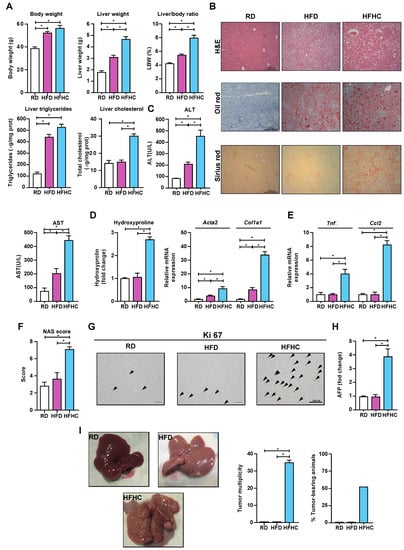 Given that the long-term combination of DEN and the ATH diet was not well-tolerated in the above studies, we could not extend this approach to induce the appearance of macroscopic tumors in the liver. Consequently, we next examined whether the increase of the liver cholesterol levels could promote NASH-driven HCC in WT mice. As a high-fat diet (HFD) alone does not induce NASH and DEN plus HFD feeding does not completely model NASH-driven HCC [36], we established a dietary NASH-driven HCC approach by feeding WT mice with a HFD diet supplemented with cholesterol (HFHC) for 10 months [37]. While the body weight gain was similar in HFD or HFHC-fed mice, the liver/body weight ratio significantly increased in HFHC-fed mice (Figure 4A). HFD and HFHC feeding induced macrovesicular steatosis with a similar increase in the liver triglycerides content (Figure 4A,B); however, HFHC feeding significantly increased the liver cholesterol levels compared to HFD-fed mice (Figure 4B). In line with the increase in cholesterol levels, the liver damage was greater in HFHC-fed mice compared to HFD-fed mice, with higher serum ALT levels (Figure 4C). Of relevance, HFHC-fed mice exhibited liver fibrosis, as seen by Sirius red staining (Figure 4B), the increased expression of Acta2 and Col1a1, and the hydroxyproline levels (Figure 4D), accompanied with a higher level of the genes involved in inflammation like Tnfα and Ccl2 (Figure 4E), resulting in a higher NAS score in mice fed a HFHC diet compared to HFD-fed mice (Figure 4F). Consistent with the background of liver injury, inflammation, and fibrosis, HFHC diet feeding increased the liver regeneration, as seen by the increased expression of Ki67 (Figure 4G) and higher expression of Afp (Figure 4H) and increased number of tumor and incidences compared to HFD-fed mice (Figure 4I). Thus, these findings indicate that a long-term dietary increase of liver cholesterol is sufficient to induce NASH progression towards HCC.