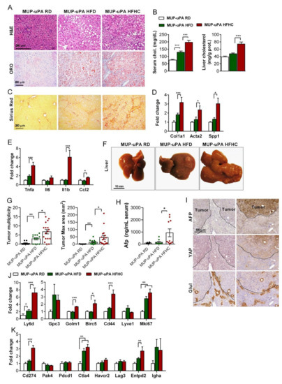 In line with the tumor burden in WT mice after long-term HFHC consumption, we next sought to determine the effect of dietary cholesterol in another established spontaneous NASH-driven HCC animal model. The transgenic MUP-uPA mice fed HFD exhibit classical signs of NASH and progressively develop HCC tumors [35,36]. This model is characterized by endogenous ER stress due to the expression of urokinase plasminogen activator (uPA) within 4–8 weeks of age, leading to cell death and the compensatory proliferation of hepatocytes with a low uPA expression to completely regenerate the liver by 12 weeks [38]. Indeed, these animals at 8 weeks of age show a coarse liver surface, immune infiltration, and mild fibrosis at this young age, which spontaneously resolves over time (32 weeks of age) (Figure S1A), in line with the normalization in the expression of the ER stress marker Ddit3, serum ALT, and Srebpf2 and Col1a1 (Figure S1B–E), as well as the genes involved in inflammation (Tnfα); tumor markers (Afp, Birc5, and Golm 1); and the immune checkpoint (Ctla4, Endtpd2, and IghA) (Figure S1F–H). Although previous studies demonstrated that feeding HFD to MUP-uPA results in HCC development [35,36], we next compared the effect of HFHC feeding to MUP-uPA mice compared to HFD in the development of HCC. H&E and Oil Red staining revealed a similar degree of hepatic steatosis in MUP-uPA fed a HFD or HFHC diet for 6 months (Figure 5A), consistent with the similar content of liver triglycerides. The cholesterol levels, however, were higher in MUP-uPA mice fed a HFHC diet both in the serum and liver compared to feeding the HFD diet (Figure 5B). While MUP-uPA mice gained body weights to a similar degree by HFD or HFHC diet feeding (Figure S2), the liver weight gain was higher in HFHC-fed than HFD-fed MUP-uPA mice (Figure S2), and this effect was accompanied by increase release of serum ALT (Figure S2). Moreover, MUP-uPA mice fed a HFHC diet developed a higher degree of fibrosis revealed by Sirius red staining and an increase in the expression of Col1a1, Acta2, and Spp1 with respect to HFD feeding (Figure 5C,D) and exhibited a higher expression of the genes involved in inflammation: Tnfα, Il1β, and Ccl2 (Figure 5E). Consistent with this background of inflammation and fibrosis, MUP-uPA mice fed the HFHC diet developed liver tumors with an increased tumor multiplicity and maximal area, (Figure 5F,G), and Afp marker in serum (Figure 5H), compared to mice fed the HFD diet. Tumors in the MUP-uPA mice fed the HFHC diet showed heterogeneous features, with different shapes and levels of expressions of HCC markers such as Afp and Yap (Figure 5I). Tumors from MUP-uPA mice fed the HFHC diet exhibited an increased expression of tumor markers Ly6d, Cd44, Golm1, and Birc5, as well as higher levels of the proliferation marker Mki67 (Figure 5J). The outcome in the MUP-uPA fed the HFHC diet was paralleled to the findings recently reported in DEN-treated WT mice fed the HFHC compared to HFD feeding [10]. Overall, these findings revealed that NASH-driven HCC is potentiated by the HFHC diet compared to HFD feeding.