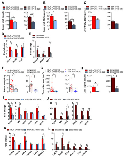 To further establish the tumor-promoter role of cholesterol in NASH-driven HCC, we next tested whether the prevention of dietary cholesterol absorption impacts HCC development. In this paradigm, MUP-uPA mice and DEN-treated WT mice were fed HFHC diet supplemented or not with ezetimibe, which prevents the intestinal absorption of cholesterol by targeting Niemann-Pick C1 Like 1 (NPC1L1) in the intestinal lumen [47]. As seen, the dietary treatment with ezetimibe reduced the serum and liver cholesterol levels in both MUP-uPA and DEN-treated WT mice, without a significant change in the liver triglycerides (Figure 6A–C). The ezetimibe treatment ameliorated a HFHC diet-induced increase in the expression of genes involved in fibrosis, Col1a1, Acta2, and Spp1 in MUP-uPA and DEN-treated WT mice (Figure 6D,E). More importantly, ezetimibe markedly reduced the multiplicity and maximal area of liver tumors from MUP-uPA and DEN-treated WT mice fed the HFHC diet (Figure 6F,G). Of interest, the tumor multiplicity in DEN-treated WT mice was higher than in the spontaneous model in MUP-uPA mice, although the maximal area was similar (Figure 6F,G). The expression of the tumor markers in both models was similar, with an increase in the mRNA levels of Ly6d, Afp, Gpc3, Birc5, and Lyve1 being higher in DEN-treated WT mice compared to MUP-uPA, while that of Cd44 was comparable in both models (Figure 6H–J). Accordingly, the upregulation of the immune checkpoints like Cd274, Ctla4, and Entpd2 induced by HFHC feeding in MUP-uPA mice and DEN-treated WT mice was abrogated by the ezetimibe treatment (Figure 6K,L). Additionally, ezetimibe downregulated the increase in the mRNA levels of Pdcd1, Havcr2, and Lag 3 induced by the HFHC diet in the DEN-treated model but not significantly in the MUP-uPA mice (Figure 6K,L). Overall, ezetimibe prevents the role of cholesterol in promoting liver tumorigenesis and NASH-driven HCC.