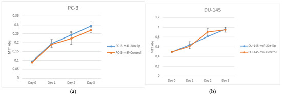 PC3 (a) and DU145 (b) cell lines were used to assess cell proliferation. PC3 and DU145 transfected with miR-20a-5p were compared to control cells. There were no significant differences in proliferation in PC3 or DU145 cell lines.