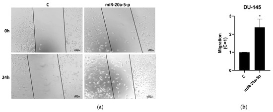 In the wound healing assays, DU145 and PC3 cell lines were transfected with miR-20a-5p to study the effect of miR-20a-5p on cell migration. There was a significant increase in migration at 24 h for miR-20a-5p transfected cells for PC3 (p < 0.05) and DU145 (p < 0.05) cell lines compared to controls, using Student’s t-test. Figure 3 shows representative results of three different experiments for both PC3 and DU145 cell lines.