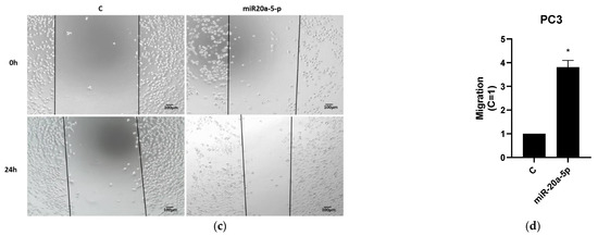 Wound healing analysis of transfected miR-20a-5p cells compared to controls in PC3 and DU145 cell lines. PC3 and DU145 cell lines showed significant (p < 0.05) migration compared to controls. Results are plotted (mean ± SEM) in relation to controls (C = 1). Figure 3 shows representative results of three experiments, performed in duplicates, while complete results from all experiments are presented in Supplementary Table S1. (a,b) Wound healing assay for DU145 cell lines; (c,d) Wound healing assay for PC3 cell lines. * Significantly different from control (p < 0.05, Student t-test).