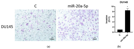 Invasion analysis was used to study the effects of transfected miR-20a-5p on invasion of DU145 and PC3 PCa cell lines. Representative results from three experiments of invasion assays for DU145 and PC3 are presented in Figure 4. After miR-20a-5p treatment, the invasion had significantly increased in DU145 cell lines (p < 0.05), by Student’s t-test.
