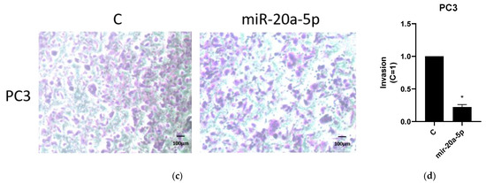 Invasion analysis of transfected miR-20a-5p cells compared to controls in PC3 and DU145 cell lines (representative of three experiments). DU145 cell lines showed significant (p < 0.05) migration compared to controls. Results are plotted (mean ± SEM) in relation to controls (C = 1). Complete results from all experiments are presented in Supplementary Table S2. (a,b) Invasion assay for DU145 cell lines; (c,d) Invasion assay for PC3 cell lines. * Significantly different from control (p < 0.05, Student t-test).