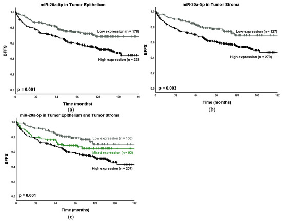 All statistical analyses were conducted with the SPSS software, version 26 (IBM, SPSS Inc., Chicago, IL, USA). Correlations between miR-20a-5p expression and clinicopathological variables were explored by Pearson’s Chi-square analysis and Fisher’s exact test. The Kaplan–Meier method was utilized to draw univariate survival curves. Presentations of the curves were terminated when under 10% of patients were at risk (at 192 months). The log-rank test assessed the statistical significance between survival curves. Cox regression analysis (backward conditional) was used for the multivariate analysis, with a probability for stepwise entry and removal at 0.05 and 0.10, respectively. Variables significant from the univariate analysis were included in the multivariate analysis. p-values < 0.05 was deemed significant for all analyses. A two-way random effect model with absolute agreement was used to test interobserver reliability between the two scorers.