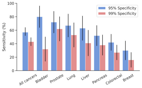 At 95% specificity, the individual organ models ranged in sensitivity from 30% for breast cancer to 80% for bladder cancer, with sensitivities higher than 50% for prostate (72% (CI: 56, 88) sensitivity), lung (67% (CI: 50, 84) sensitivity), liver (63% (CI: 45, 81) sensitivity), and pancreas (52% (CI: 37, 67) sensitivity). At 99% specificity, the individual organ models ranged in sensitivity from 16% for breast cancer to 62% for prostate cancer (p = 0.001). The bladder differed from the breast model (p = 0.0018) and the colorectal model (p = 0.0102), the breast model from the lung (p = 0.0120) and prostate (p = 0.0052) models, and the prostate model from the colorectal model (p = 0.0268). Detection performance for the “all cancer” and individual organ models can be found in Table 2 and Figure 2.
